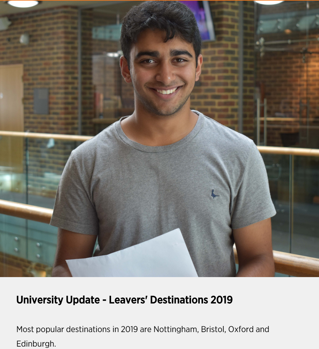 几乎所有的学生都进入了顶尖大学(2017年,85%的离校生去了罗素集团大学,其中12%去牛津大学和剑桥大学,8%去医学院学习)