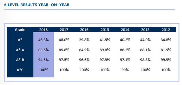 在2014 年的GCSE 考试中,该校学生获得A/A* 成绩的比例在95.9%。同年,该校的A-Level 名列第六,其中获得A/A* 成绩占的百分比为85.9%。据统计,该年的离校生中有16 位获得了牛剑的录取通知书。