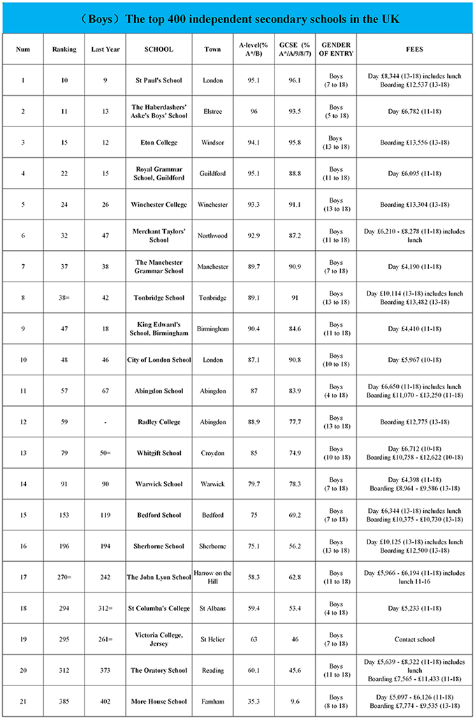 排名第一的圣保罗学校成立于1856年,是伦敦的一所寄宿制合校,提供9年级-12年级教育。圣保罗学校是一所主教学校,由来自全球各地的525名学生组成。圣保罗是英国极少数没有走读生的寄宿制学校,所有学生和教职工都住在学校内,因此,学生可以在宿舍内一起学习、玩耍,即便离家千里也可以得成年人的指导和帮助。圣保罗治学严谨,所有老师都会花时间了解学生,不管是在课堂、宿舍还是在运动场上。中学阶段是个性形成的重要时期,很多圣保罗的校友都表示他们在圣保罗结交到了一辈子的好友。