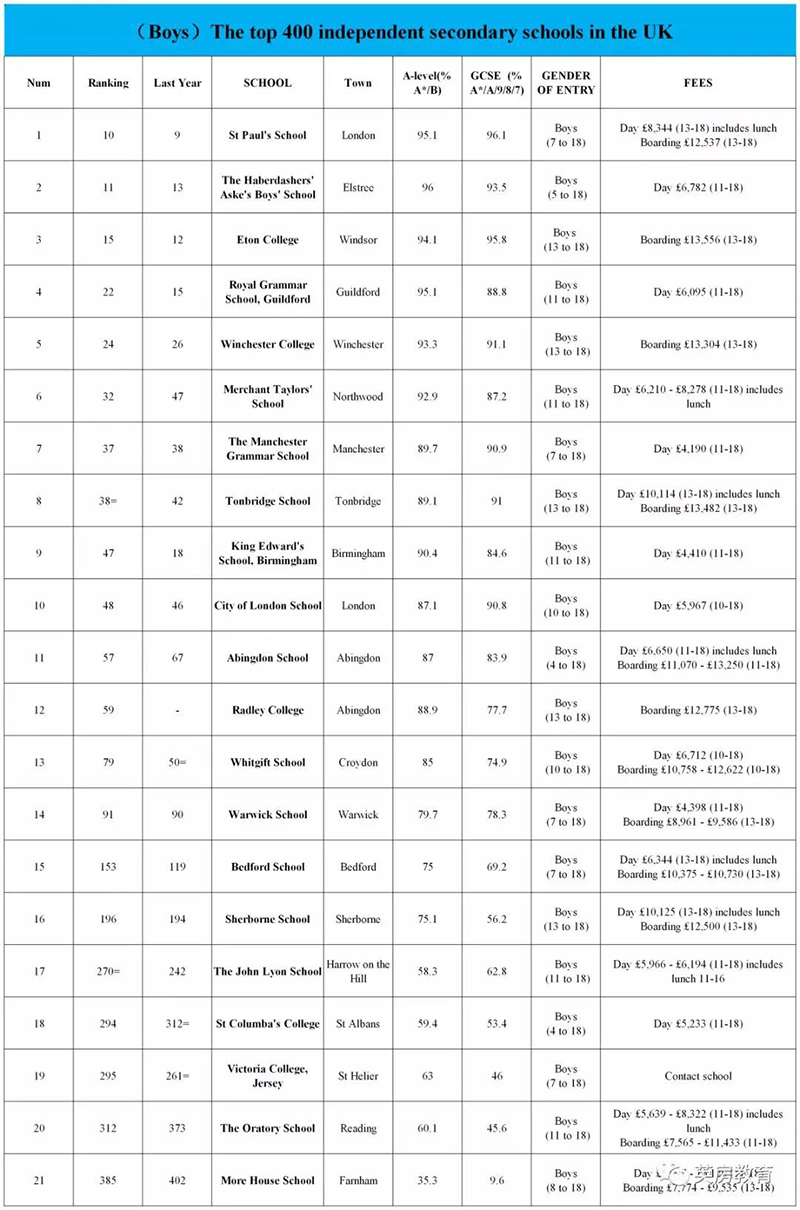 排名:《泰晤士报》男校排名第7(见下表)
