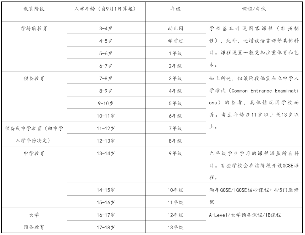下面,我们以私立学校为例,看看英国中小学教育的主要阶段及课程安排: