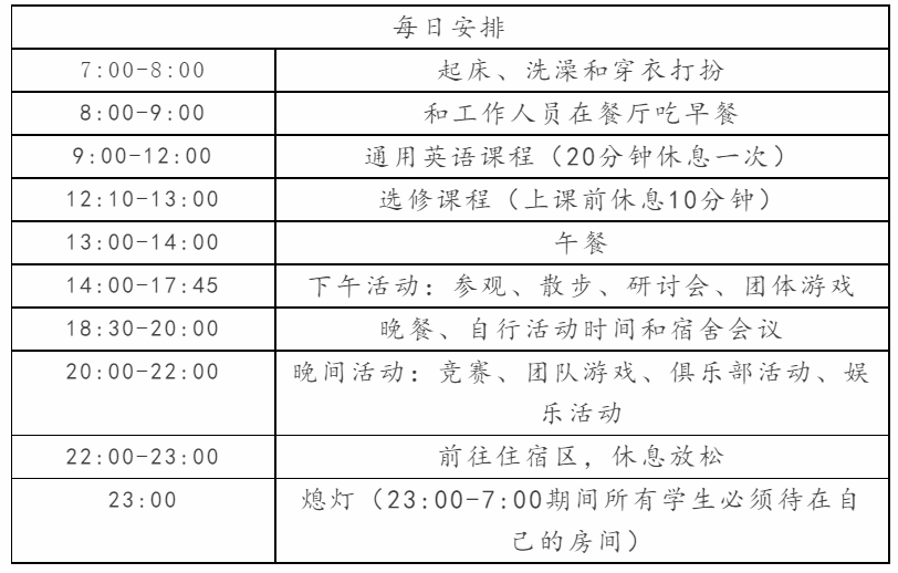 所有学生都住在带浴室的单间内,夏令营有关工作人员也住在同一宿舍区,宿舍管理制度严格,可以保证所有学生的安全。