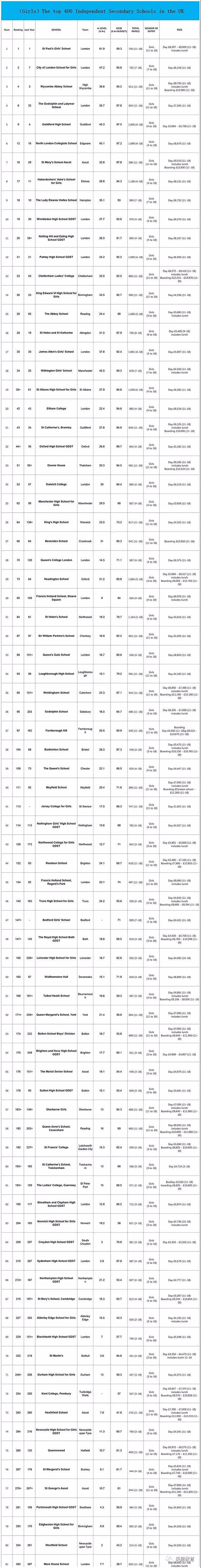 排在榜首的即英国最顶级的女校——圣保罗女子学校。圣保罗女子学校成立于1904年,是英国的首批女子学校之一,始终致力于充分发挥女性潜能,赋予女性技能和自信,使她们在快速变化的现代化世界得到社会认可,获得自豪感。这是圣保罗女子学校的核心理念。