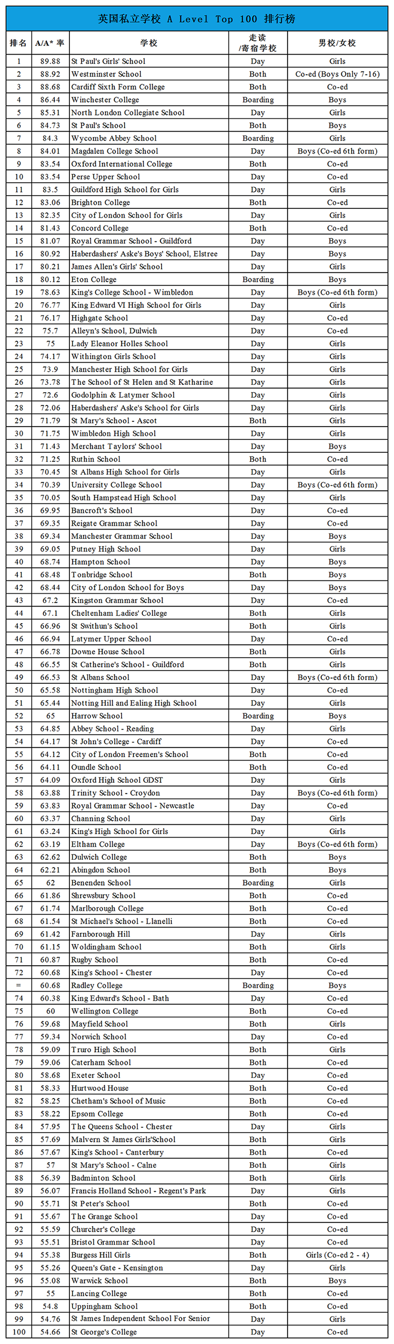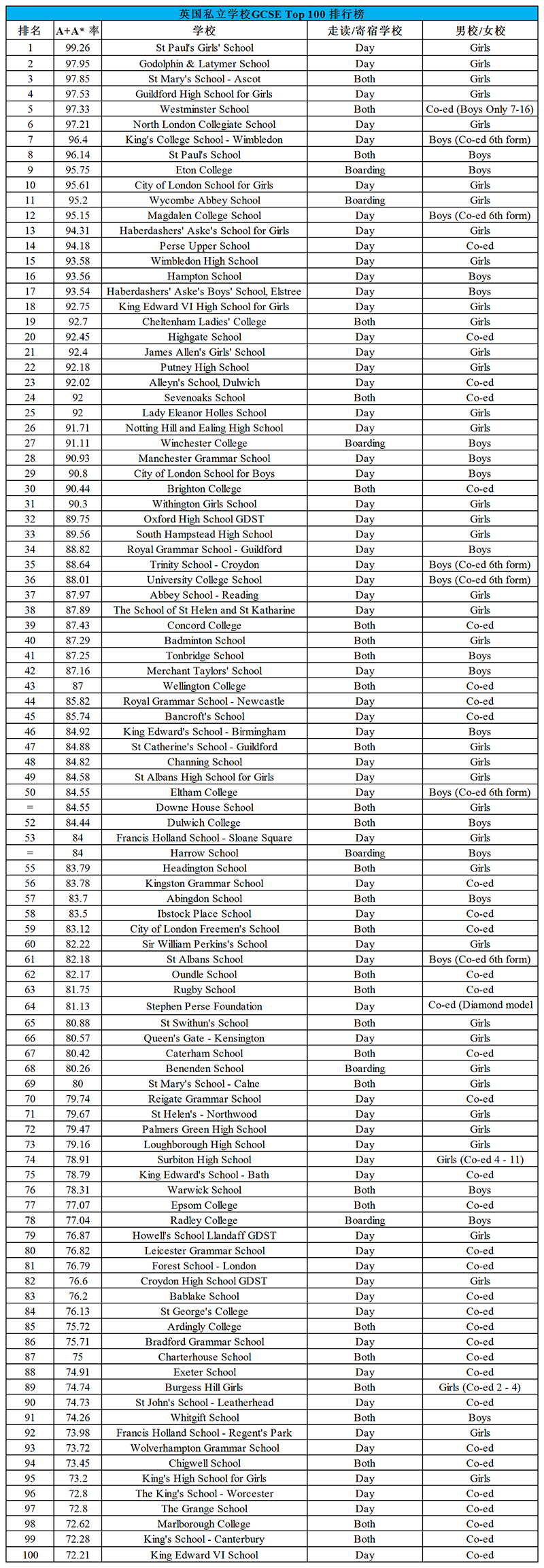 以下是Best Schools英国中学GCSE和A-level的排名情况,希望对大家有帮助哦!