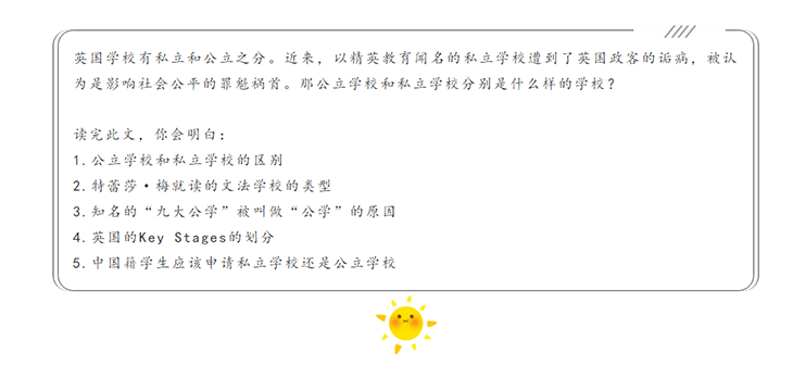 公立学校里有一类学校叫做文法学校(Grammar School),与其他公立学校不同的是,这类学校设有严格的入学考试,重点大学升学率高,被誉为英国“性价比”最高的中学。英国首相特蕾莎·梅就毕业于文法学校。