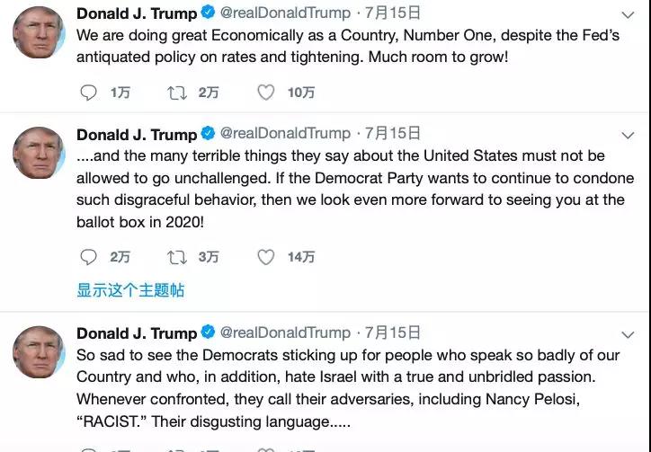 据CNN报道,特朗普14日发布推特说,那些民主党“进步”女议员真的有趣。她们原本来自那些世界上最糟糕、腐败、无能政府控制下的国家(或者连个正常运作的政府都没有),现在却要来教美国这个地球上最伟大和强大的国家的民众,如何运作我们的政府。“为什么她们不回自己的国家,那些支离破碎、犯罪猖獗的国家去解决问题。”“这些地方非常需要你们的帮助,你们得尽快去帮忙,我确信南希·佩洛西会很乐意给你们免费安排行程的!”