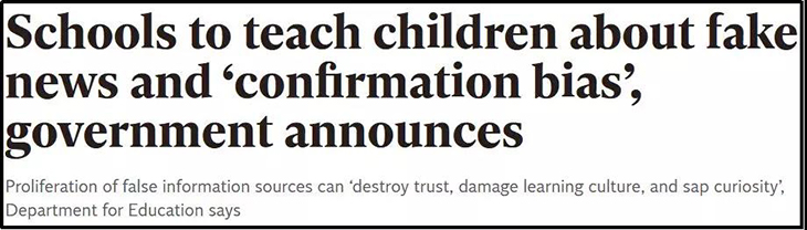 根据英国政府发布的新安全指南,作为必修课程,每一名学生都将学习“确认偏误”和其他网络风险。“确认偏误”是指人们会倾向于寻找能支持自己观点的证据,对支持自己观点的信息更加关注。老师必须帮助学生学会评估网络信息,发现潜在风险,这将使学生更高效地辨别假新闻,并及时做出反应。