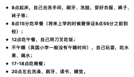 上学之前一两个月开始倒“时差”,让小朋友养成习惯,准时起床、吃饭、睡觉等,将来上学时适应起来就容易许多。比如: