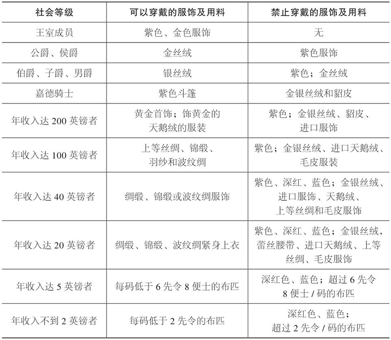 16世纪,受宗教改革影响,乡绅、小贵族和中产阶级拥有了更多的财富,服饰上的奢靡僭越对社会等级造成了严重的冲击,英国政府对服饰的管制也达到了前所未有的严厉程度。议会先后通过了5项国家法令,枢密院也发布了12条王室敕令。每项抑奢法都包含许多限定服饰规制的繁文缛节,明令在服饰的色彩和用料上,不同等级可以穿戴及不能逾越的规则。