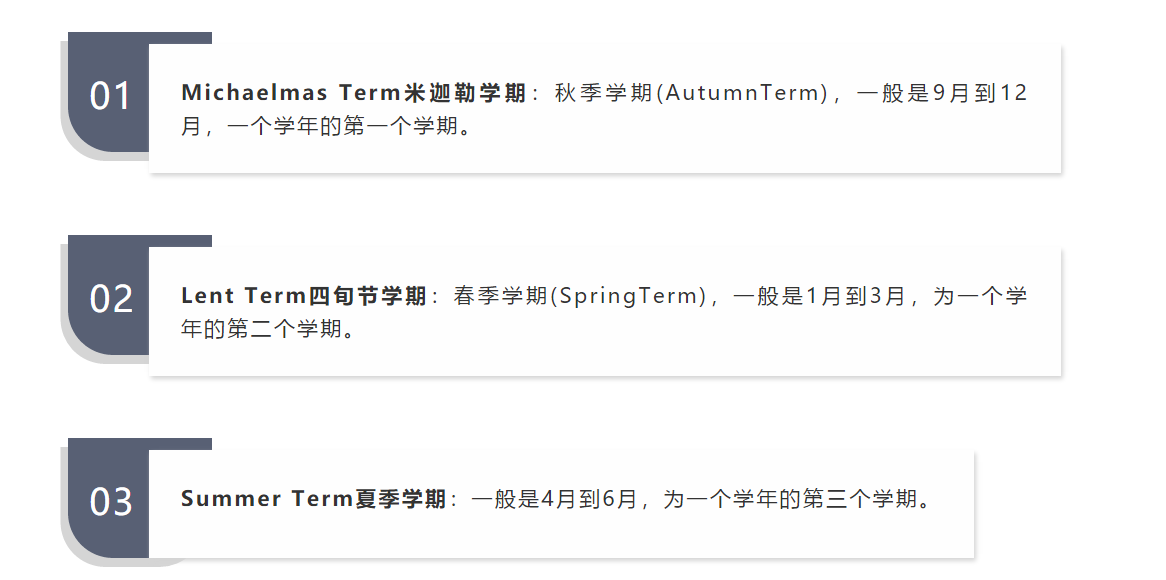 有些学校还采用古老的学期命名制度,现在英国有些传统大学,比如牛津大学、剑桥大学、伦敦政治经济学院等,也继续保留着这项传统: