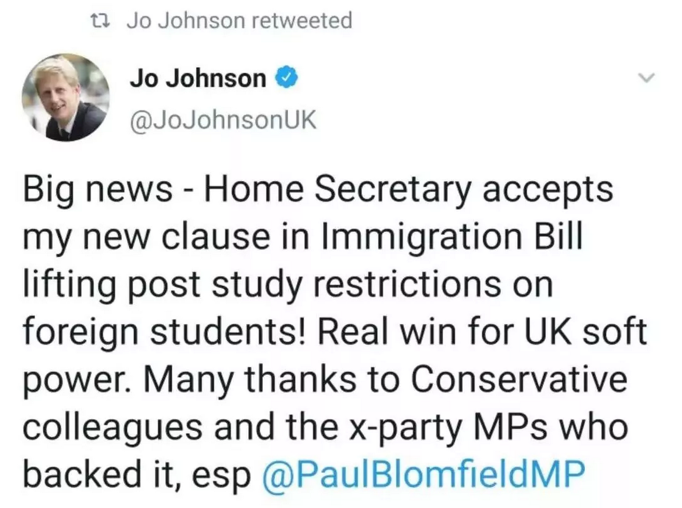 英国大学的首席执行官艾丽斯泰尔•贾维斯(Alistair Jarvis)表示, “我们强烈推行这一政策,这些学生不仅是世界各地的优秀毕业生,而且还可以继续将他们的才能发扬光大。”